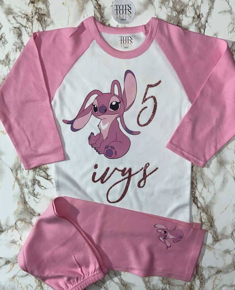 One pair of White/pink two piece pyjamas set complete with Professionally heat applied design.