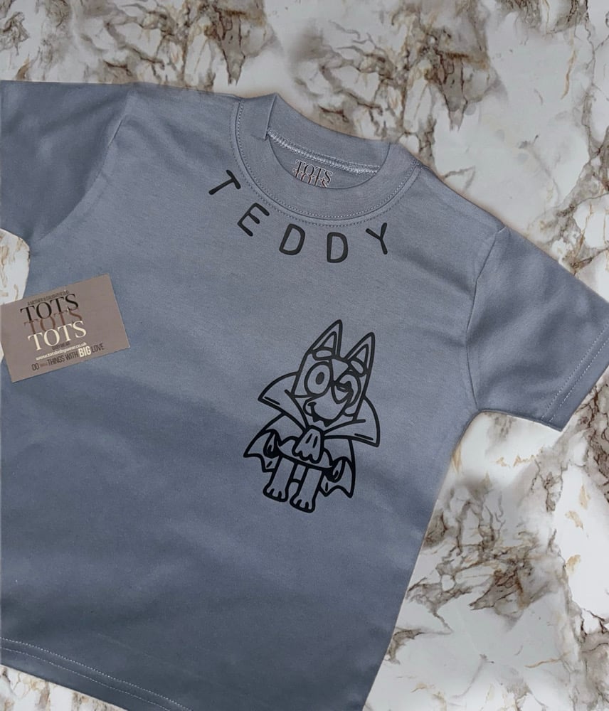 One dusty blue short sleeve T-shirt. Complete with Professionally heat applied design.