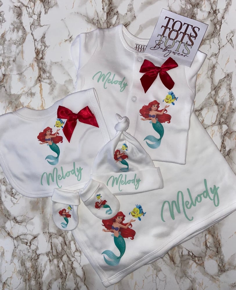 5pc Full Baby Gift Set can be purchased. All items complete with Professionally heat applied design. (4pc set for 6-9 months and over ages)