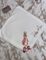 White shade 100% Cotton blanket complete with Professionally heat applied design. Option of hand stitched bow attached.