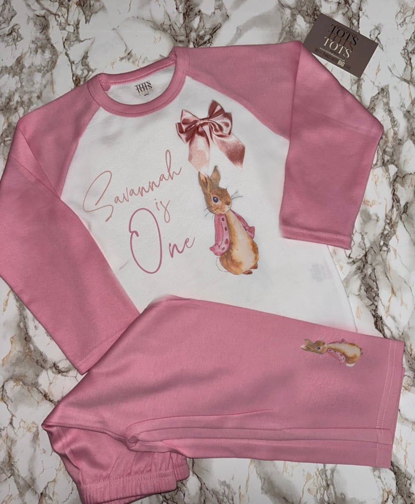 Pink/White two piece pyjamas set complete with Professionally heat applied design.
