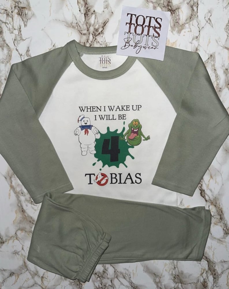Sage/White two piece pyjamas set complete with Professionally heat applied design.