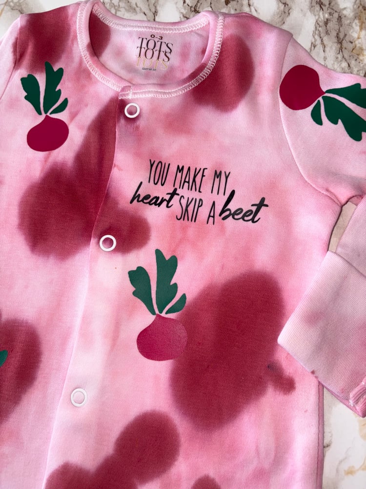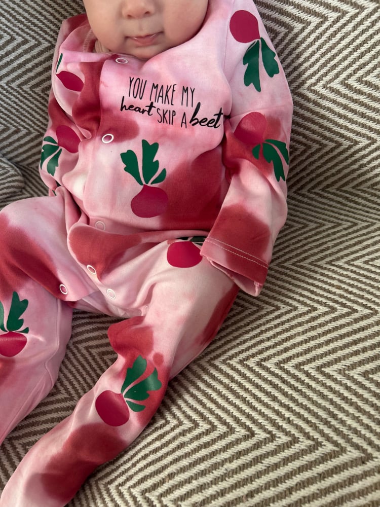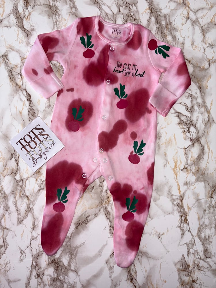 Hand tie dyed baby sleepsuit. Including Professionally heat applied design on front only no text or imagery on the back.