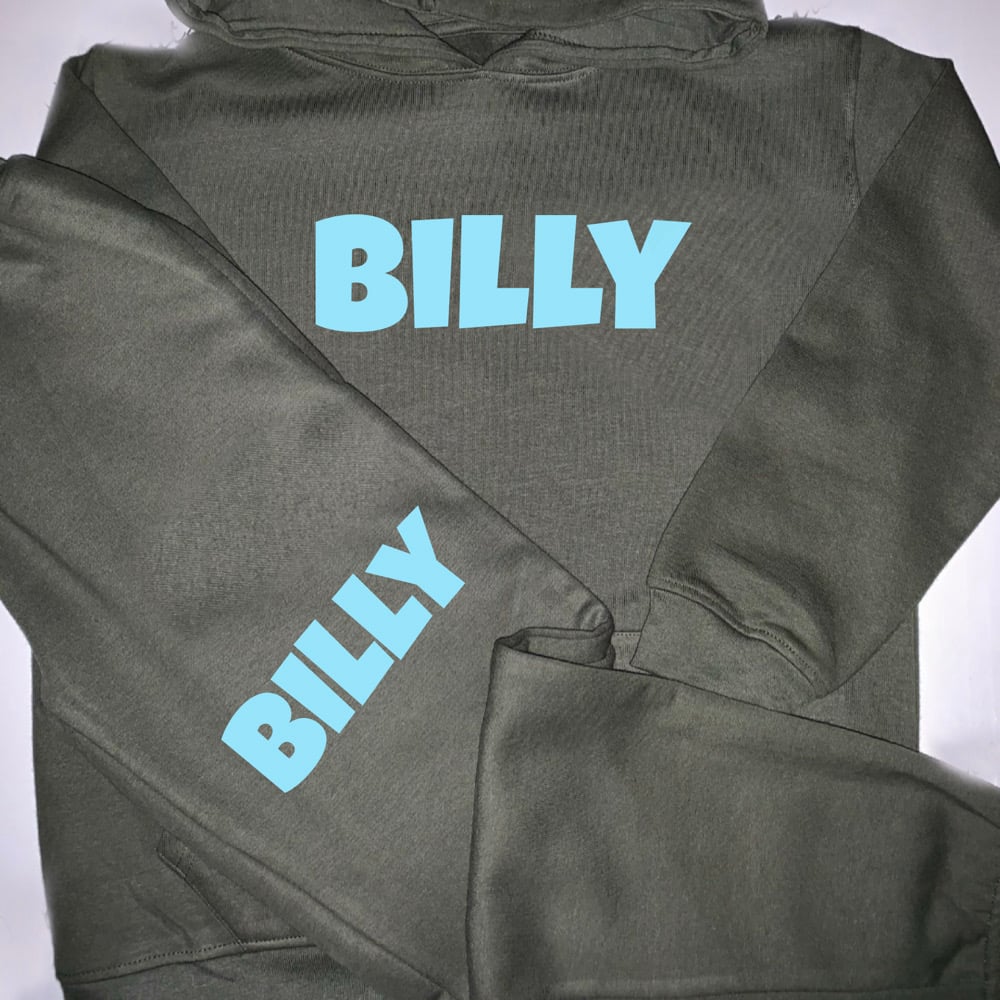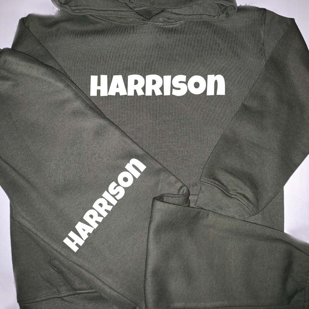 Khaki children's hoodie and joggers set. Professionally heat applied design.