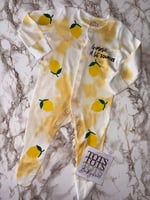Hand tie dyed baby sleepsuit. Including Professionally heat applied design on front only no text or imagery on the back.
