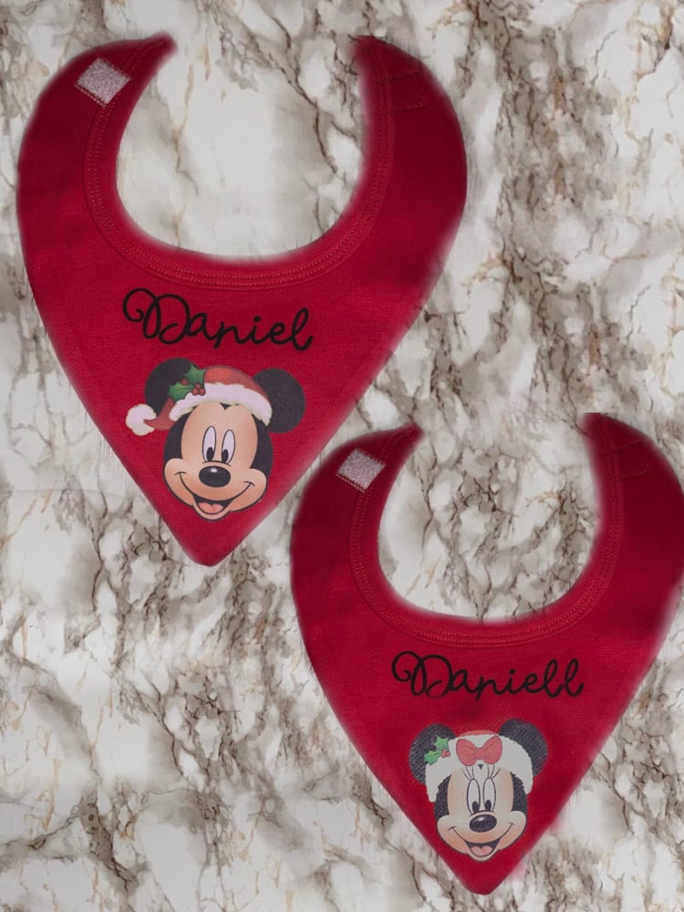 One bandana style baby bib. Including Professionally heat applied design.