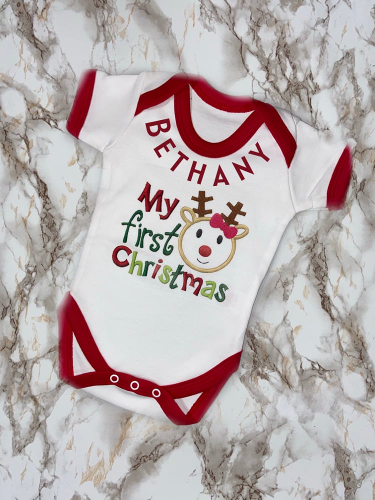 One short-sleeve baby Bodysuit. Including part embroidery and part Professionally heat applied design.