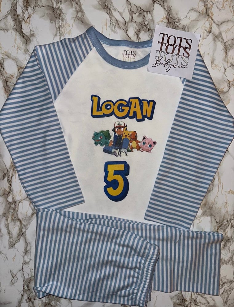 Blue/White stripe two piece pyjamas set complete with Professionally heat applied design.