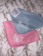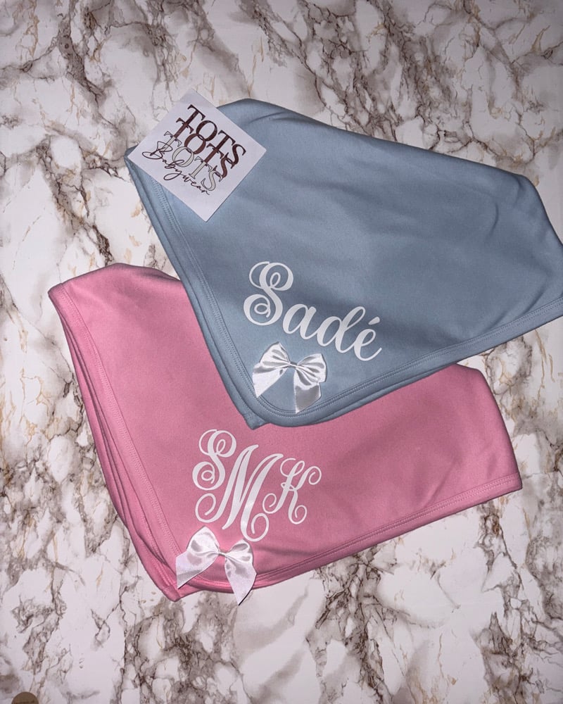 Blue or pink shade 100% Cotton blanket complete with Professionally heat applied design. Option of hand stitched bow attached.