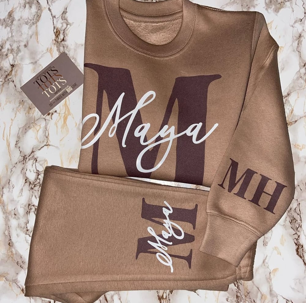 Taupe children's sweatshirt and joggers set. Professionally heat applied design.