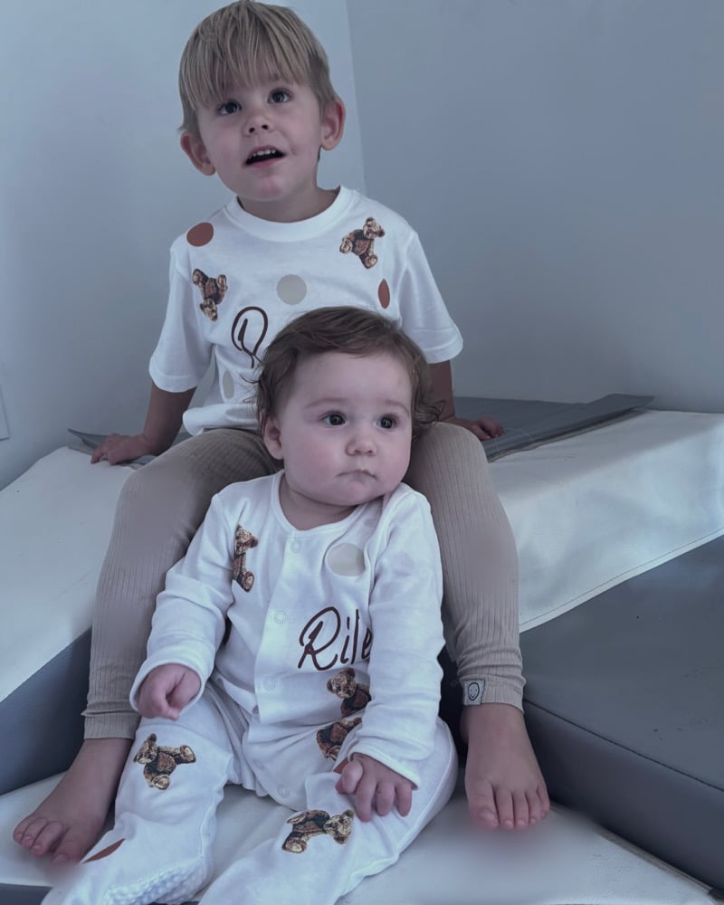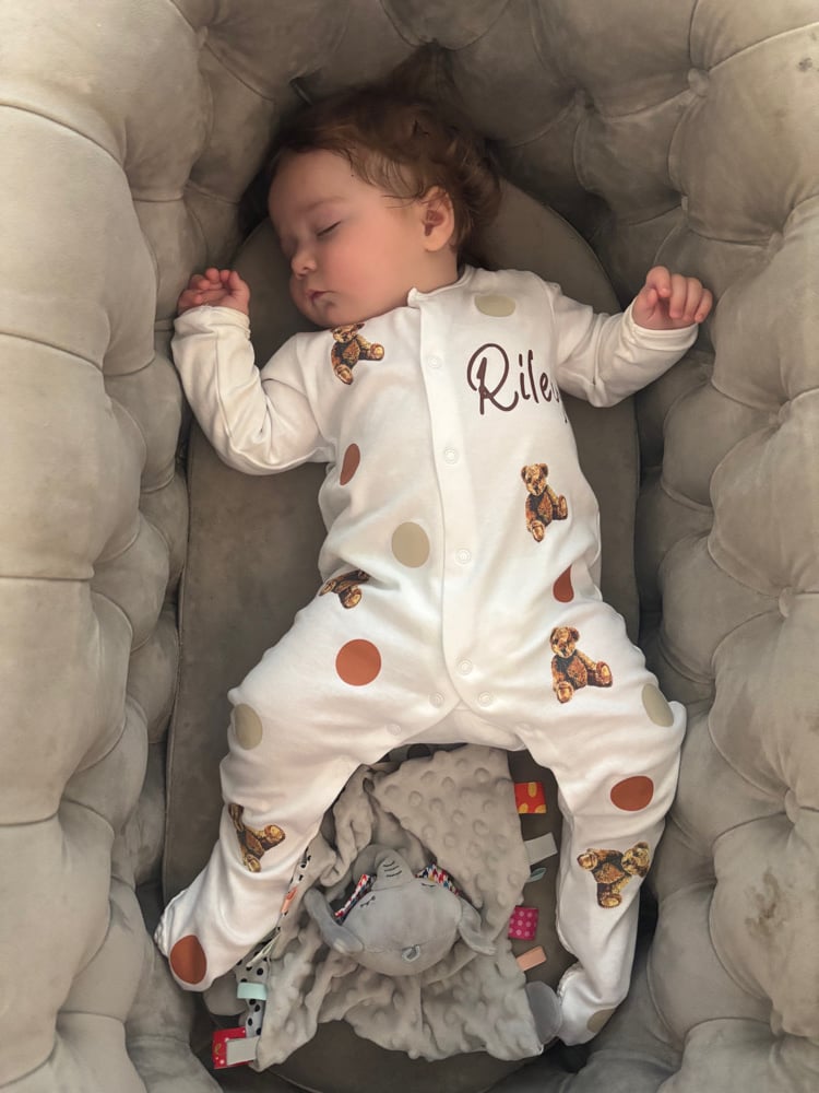 Sleepsuit includes images on two front sides of sleepsuit only. Name on small chest as shown.