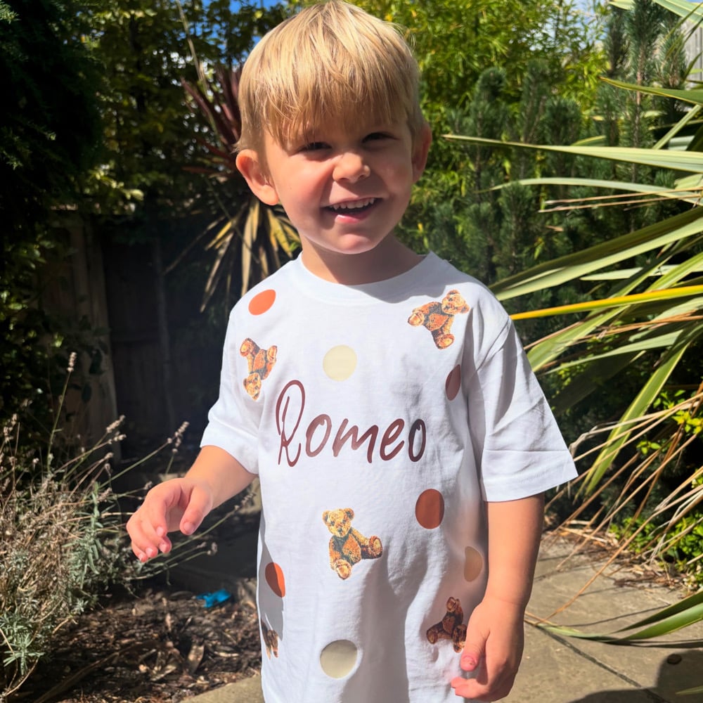 T-shirt includes images on front centre only and name in centre of the tshirt.